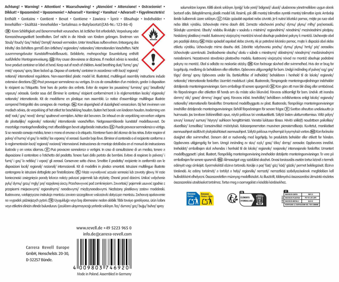 Használati utasítás: Vizes bázisú akrilfesték. Használat előtt jól keverje fel a festéket. Vigye fel ecsettel vagy szórópisztoly segítségével száraz, tiszta felületre. Nem gyúlékony alap, gyorsan szárad - 1 óra után festhetetlen, teljesen szárad 2-3 óra alatt, a réteg vastagságától függően. Szükség esetén hígítsa vízzel. Nem megfelelő hígító használata tönkreteheti a festéket! Tisztítsa Revell Aqua Color Clean hígítóval. Fújás esetén maximum 20-25%-os hígítás ajánlott. Használat után azonnal öblítse le az ecsetet és a szerszámokat vízzel. Használat után szorosan zárja le a tartályt. Felbontás után a lehető leghamarabb használja fel, a festék levegőn szárad. Fagytól védendő. 5-klór-2metilizotiazol-3(2H)-on és 2-metilizotiazol-3(2H)-on keverékét tartalmazza magnézium-kloriddal és magnézium-nitráttal. Allergiás reakciót válthat ki.