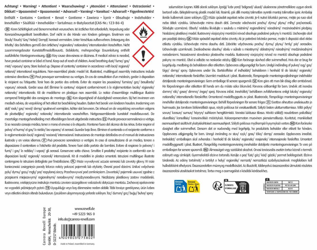 Figyelem! Tartalmaz: n-Butil-acetátot. Tűzveszélyes folyadék és gőz. Álmosságot vagy szédülést okozhat. Orvosi tanácsadás esetén tartsa kéznél a termék edényét vagy címkéjét. Gyermekektől elzárva tartandó. Használat előtt olvassa el a címkét. Hőtől/szikrától/nyílt lángtól/forró felületektől távol tartandó. Tilos a dohányzás. Ez a termék nem játék!