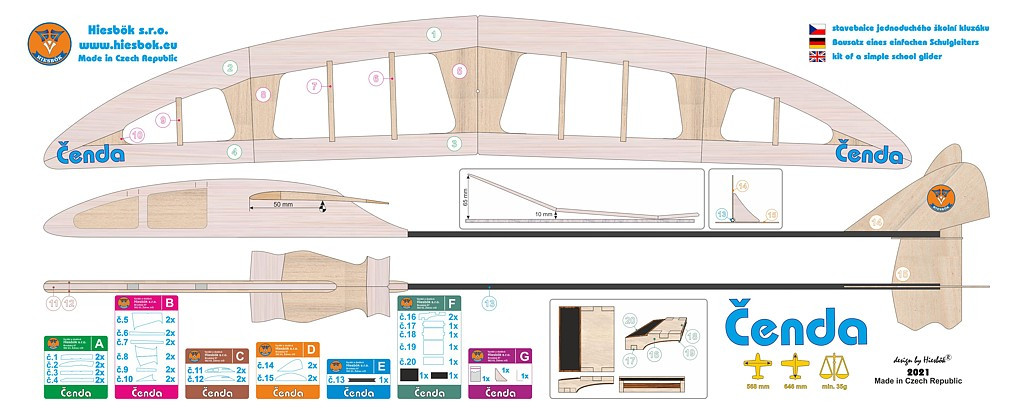 Küldj egy érdeklődéstA Čenda egy összetettebb versenydobógép, amelyet haladó modellezők számára terveztek. A készlet nem tartalmaz csiszolócsíkokat a modell szárnyához, de tartalmaz egy szerszámot, amellyel a ragasztott szárnyat a kívánt profilra lehet csiszolni. A gyerekek kipróbálhatják rajta a modell szárnyának precíz csiszolását.