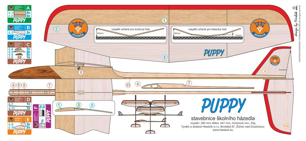 Küldj egy érdeklődéstA Puppy egy iskolai modell. Több változatban is megépíthető. A gyerekek kipróbálhatják rajta az építést, a repülést, az igazítást és a repülés különböző módjait. A készlet tartalmazza a szárny elülső élének csiszolt nyersdarabját. A szárny úgy van kialakítva, hogy az építés során automatikusan negatívok keletkeznek a végein.