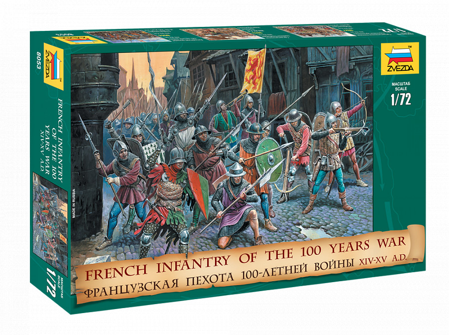 Küldj egy érdeklődéstFrancia gyalogosok a százéves háborúból. A készlet 43 festetlen figurát tartalmaz különböző pozíciókban, fegyverekkel és felszereléssel.