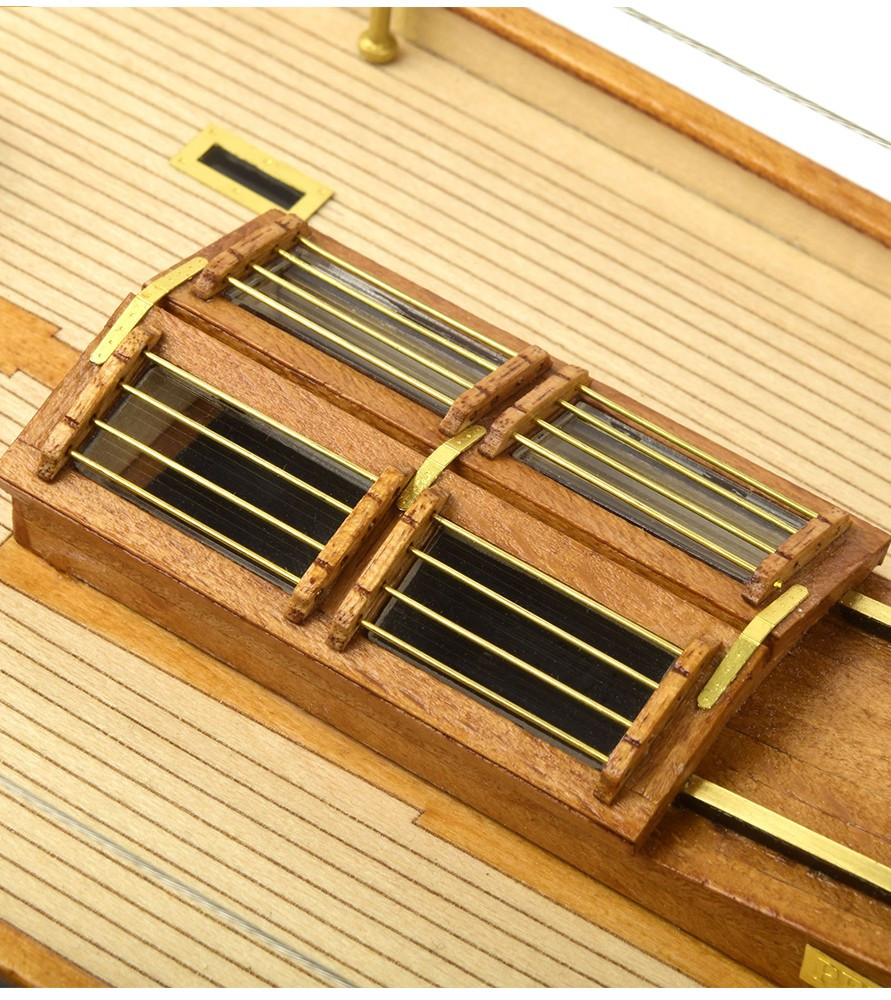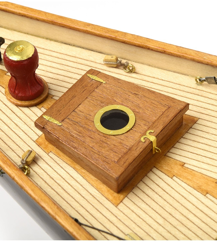 A készlet tartalmaz lézerrel vágott rétegelt lemez alkatrészeket, hajótest deszkázat léceket, amerikai tölgy furnér léceket, sárgaréz és öntött fém kiegészítőket, fotomaratott alkatrészeket, cérnákat, pamut vitorlákat, egy zászlót és állványépítéshez szükséges alkatrészeket.