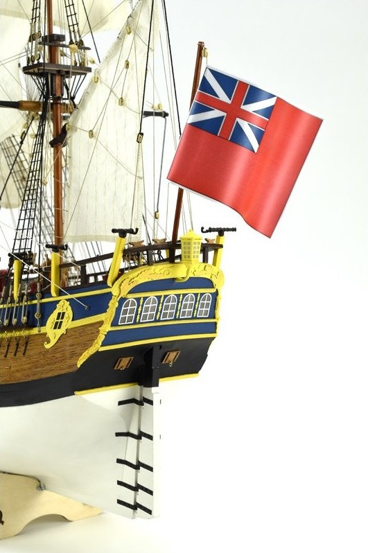 Egy tökéletesen kidolgozott, fából készült HMS Endeavour modellkészlet 1:65 méretarányban, 1768-ból, a neves spanyol Artesania Latina gyártótól.