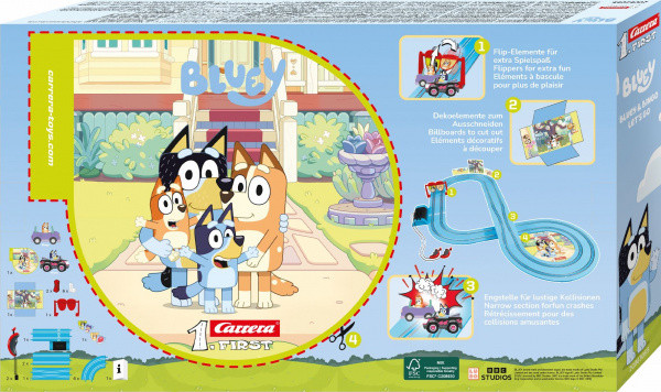 Autodráha Carrera 1. First dlouhá 2,9 m s auty Bluey a Bingo. Autodráha, která je vhodná pro děti od 3 let, obsahuje rovinky, zatáčky, bránu pro větší zábavu při jízdě, ovladače a dekorace s tématikou Bluey a Bingo. Autodráha se napájí prostřednictvím 4 malých monočlánků typu C.