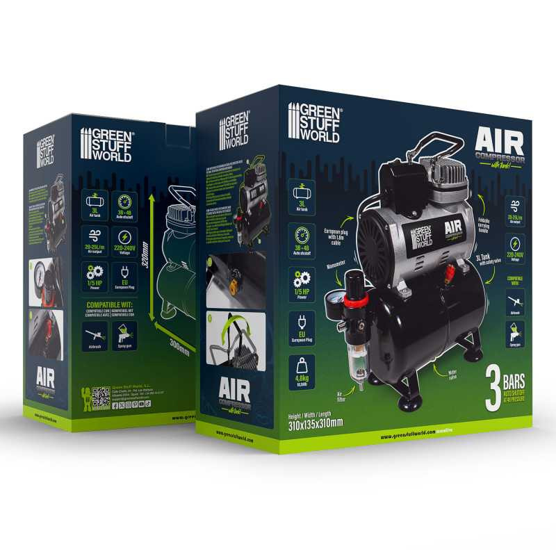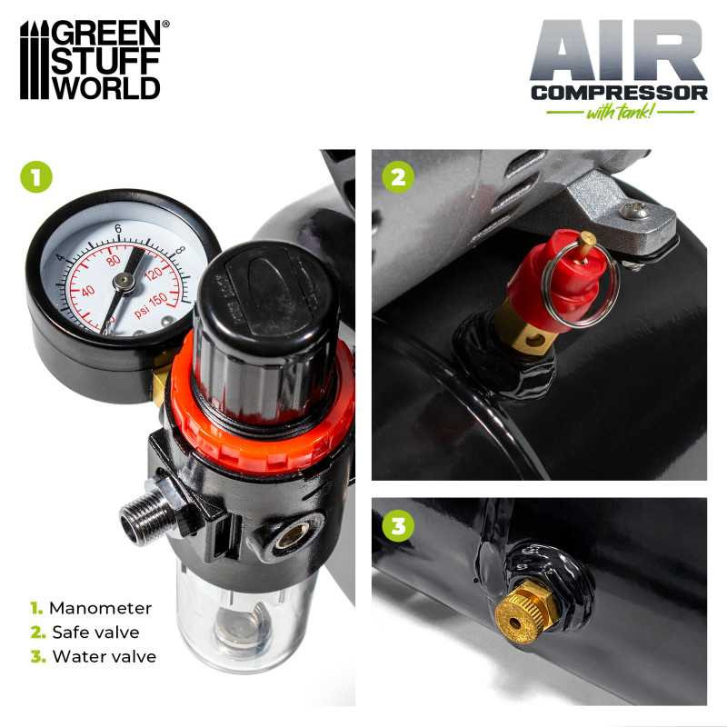 A kompresszor nyomásmérővel van felszerelve, amely kijelzi a bevitt levegő nyomását, valamint vízleválasztóval. A Green Stuff World kompresszor alkalmas modellezőknek, illusztrátoroknak, tortadíszítéshez, sminkkészítéshez és egyéb kreatív tevékenységekhez.