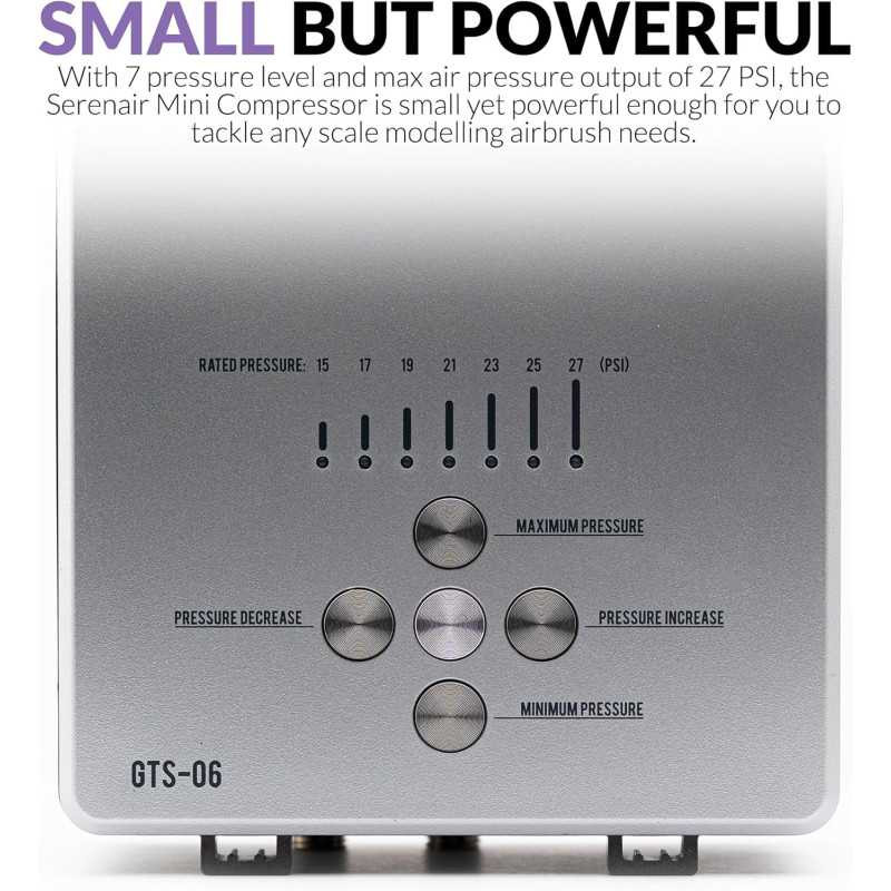 Díky až sedmi nastavitelným úrovním tlaku a maximálnímu výkonu 27 Psi poskytuje minikompresor GTS-06 Serenair plynulý a rovnoměrný přísun stlačeného vzduchu. Ať už nanášíte jemné stínování, nebo základní nátěr, tento kompresor zajišťuje optimální kontrolu. Možnost nastavení tlaku vzduchu umožňuje pracovat se širokou škálu barev a technik.