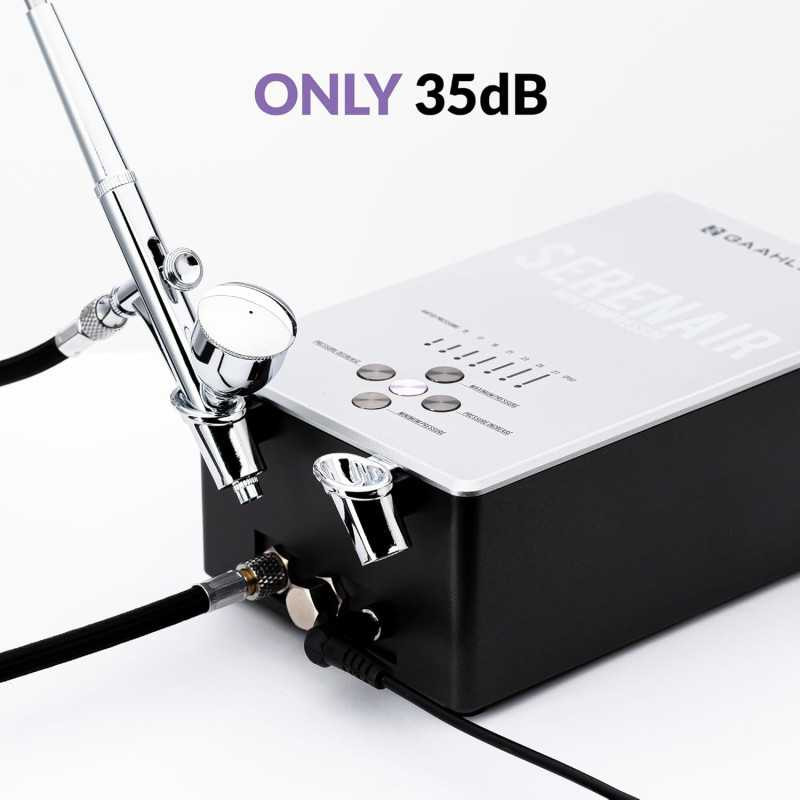 Minikomproser Gaahleri GTS-06 Serenair má dva výstupy pro stlačený vzduch, takže je možné připojit dvě stříkací pistole současně. To je skvělé pro rychlou změnu barev, nebo pokud potřebujete mít rychle k dispozici dvě pistole s různým průměrem trysky. Výhodou je rovněž nízká úroveň hluku (přibližně 35 dB), takže můžete pracovat klidně i doma.