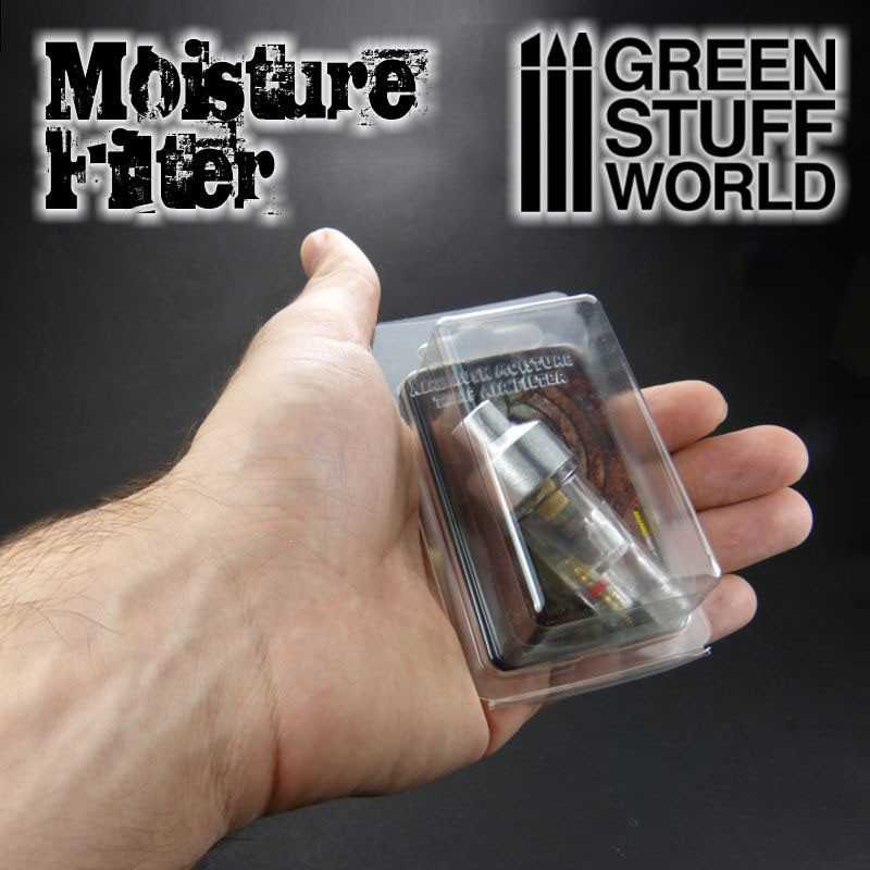 Green Stuff World kompakt légszűrő vízleválasztóval airbrush pisztolyokhoz. A légszűrő közvetlenül a pisztoly sűrített levegő bemenetére van csavarozva. Így a pisztoly jobban illeszkedik a kézbe, miközben a csukló teljesen ellazul.