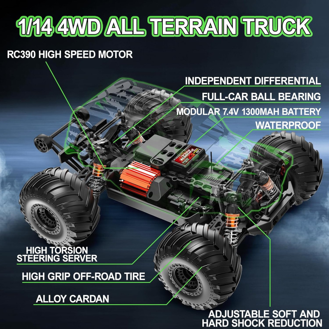Egy teljesen komplett, 1:14 méretarányú, távirányítású monster truck modell 4WD-vel és akár 40 km/h maximális sebességgel. A csomag tartalmaz egy 2,4 GHz-es pisztoly adót, egy 7,4 V-os 1300 mAh-s Li-Ion moduláris meghajtó akkumulátort és egy USB töltőt.