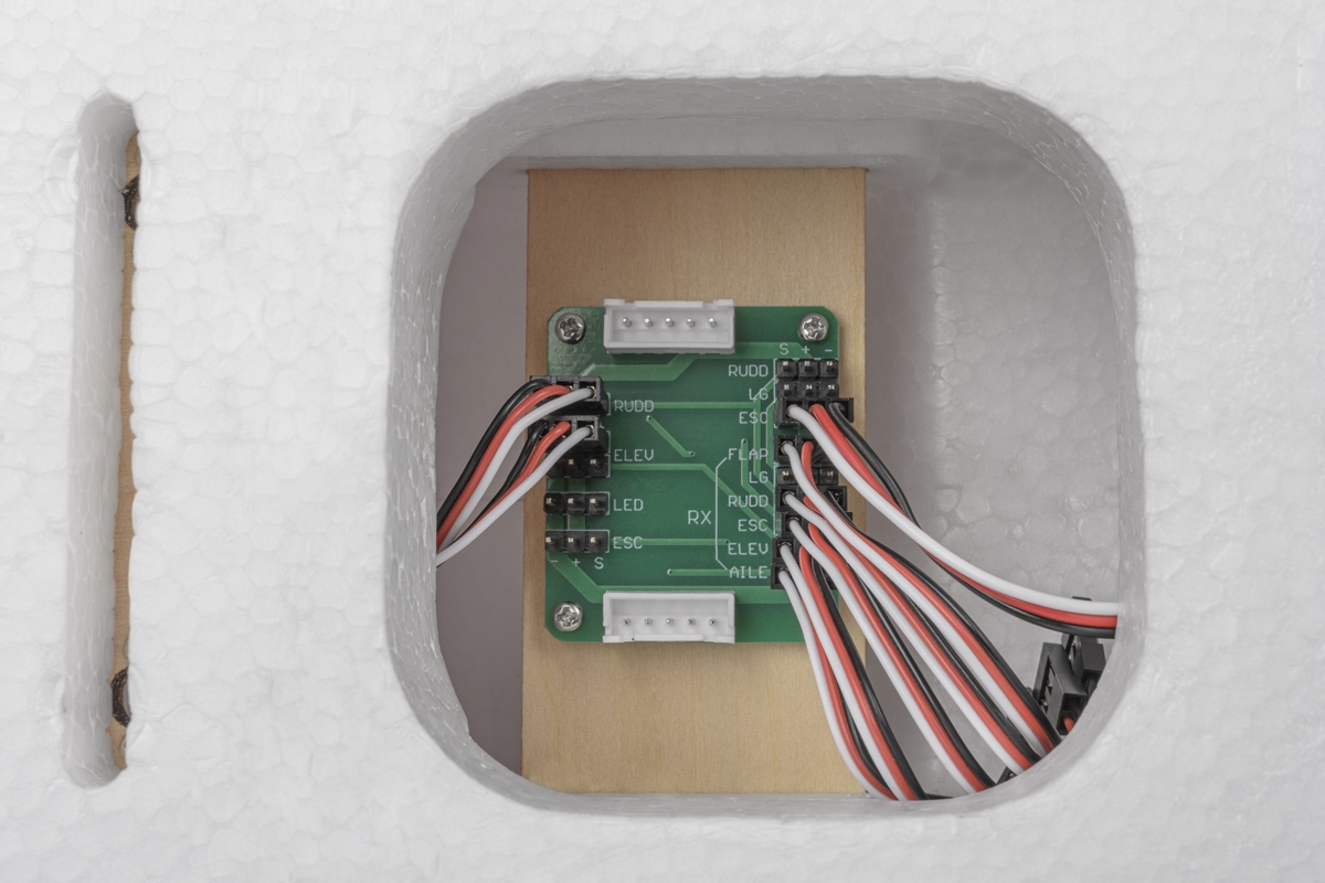 Az áramköri lap a LED-es lámpák áramellátását is biztosítja. Ideális esetben legalább egy hétcsatornás, ACCESS / ACCST D16 protokollal rendelkező adóegységet kell használni, amely lehetővé teszi a csűrők és a fékszárnyak független vezérlését két szervomotorral.