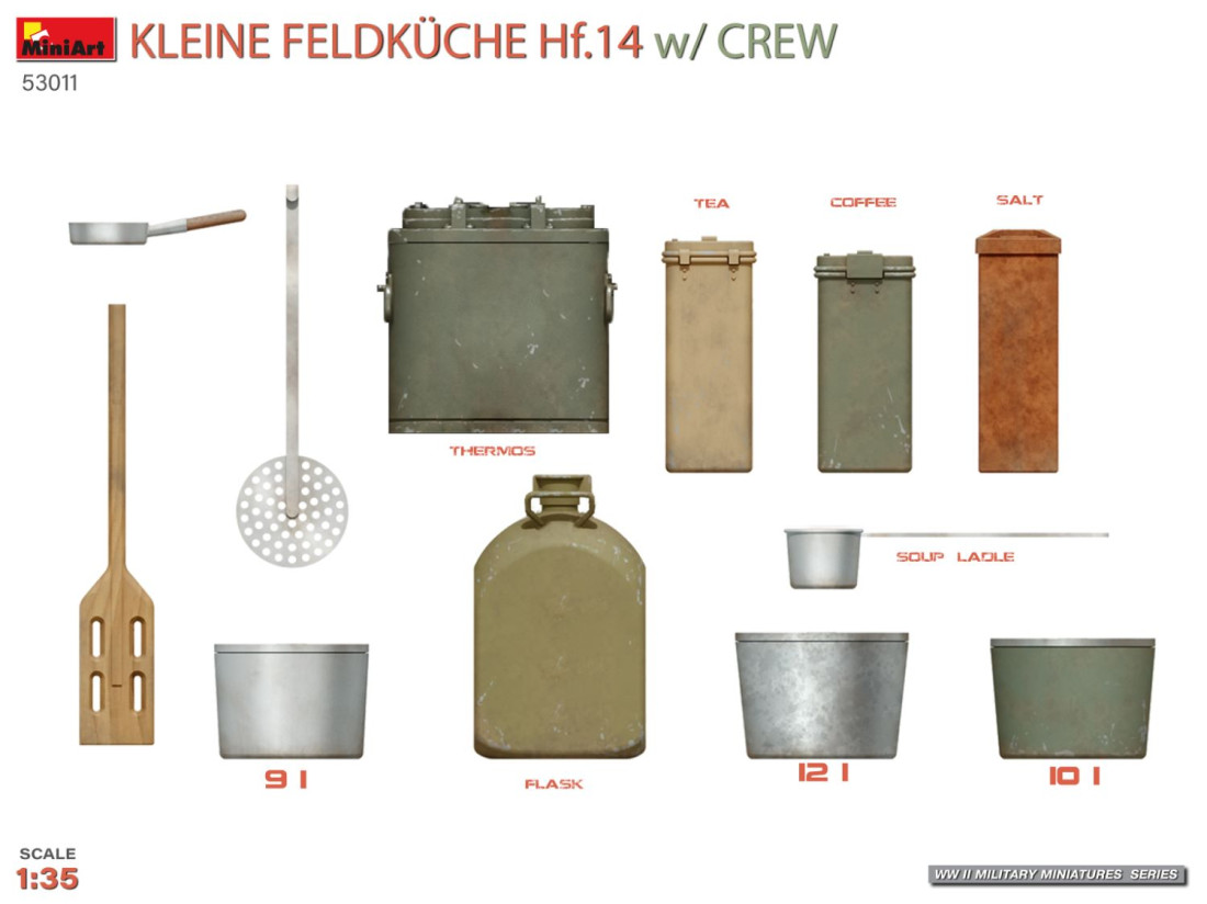 • a készlet tartalmaz műanyag díszléceket egy Hf.14-es tábori konyha építéséhez és 4 részletes figurát;